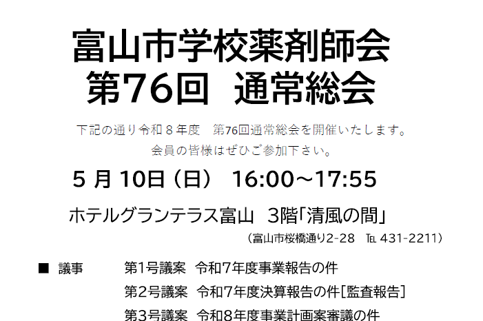 富山市学校薬剤師会 第76回通常総会のお知らせ