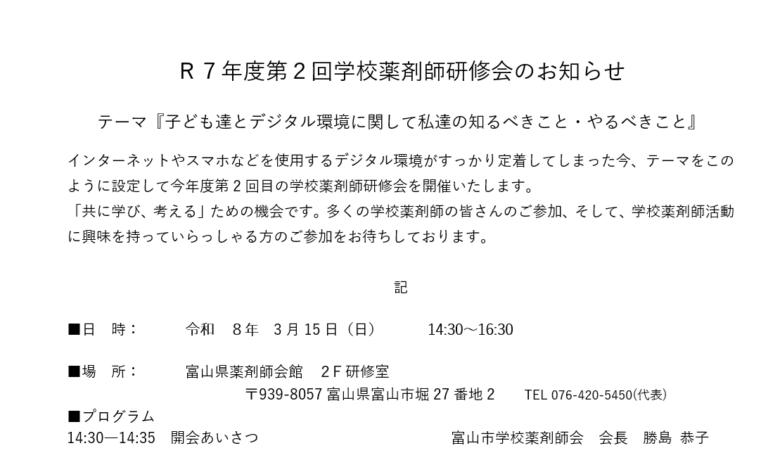 令和7年度 第2回学校薬剤師研修会 のお知らせ